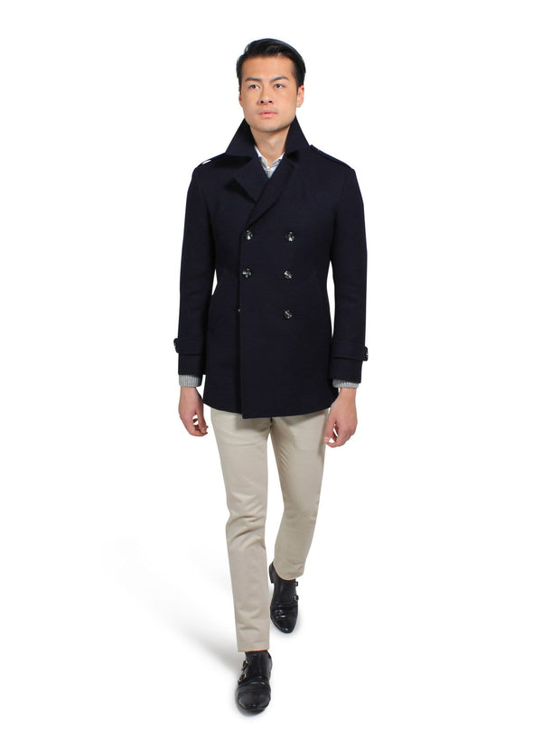 This dark green shade makes it as adaptable as it is elegant. Comfortably tailored from Mongolian Camel and wool blend, this warm Double-Breasted peacoat features flap pockets and a soft shoulder.